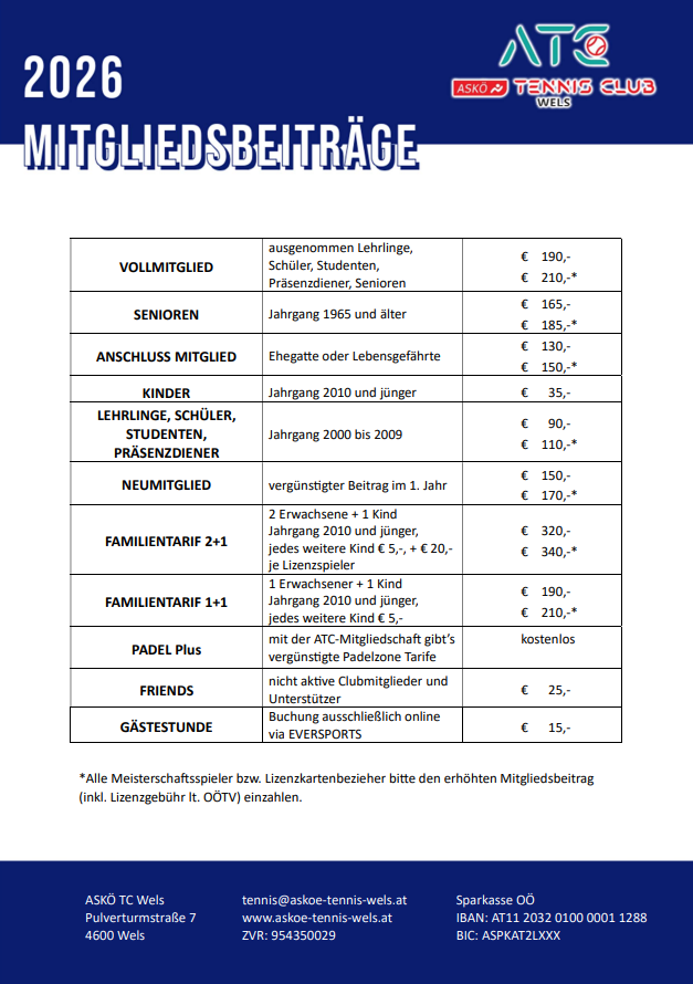 Wir laden euch herzlich zur Vereinsmeisterschaft 2025 ein! Von Freitag 5.9. bis Samstag 13.9. ermitteln wir in den jeweiligen Spielkategorien unsere ATC-Vereinsmeister. Gespielt wird wie im Vorjahr in Turnierform (K.o.-System) mit einem B-Bewerb bei Erstrundenaus, somit haben alle Teilnehmer zwei garantierte Spiele. Alle Bewerbe werden als mixed-Bewerbe gespielt, ihr könnt euch sowohl im Einzel- als auch im Doppelbewerb anmelden. Auch für unsere Senioren gibt es wieder einen eigenen Turnierraster.